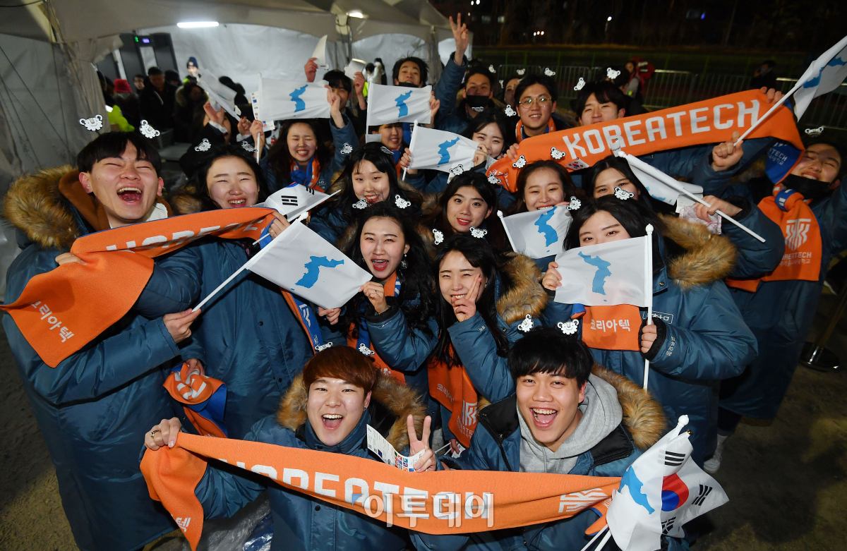 2018 평창동계올림픽 여자아이스하키 남북단일팀의 예선 첫경기인 스위스전이 10일 강원 강릉시 관동하키센터에서 열렸다. 경기 시작 전 관람온 한국기술교육대 학생들이 한반도기를 들고 즐거워하고 있다. 이동근 기자 foto@