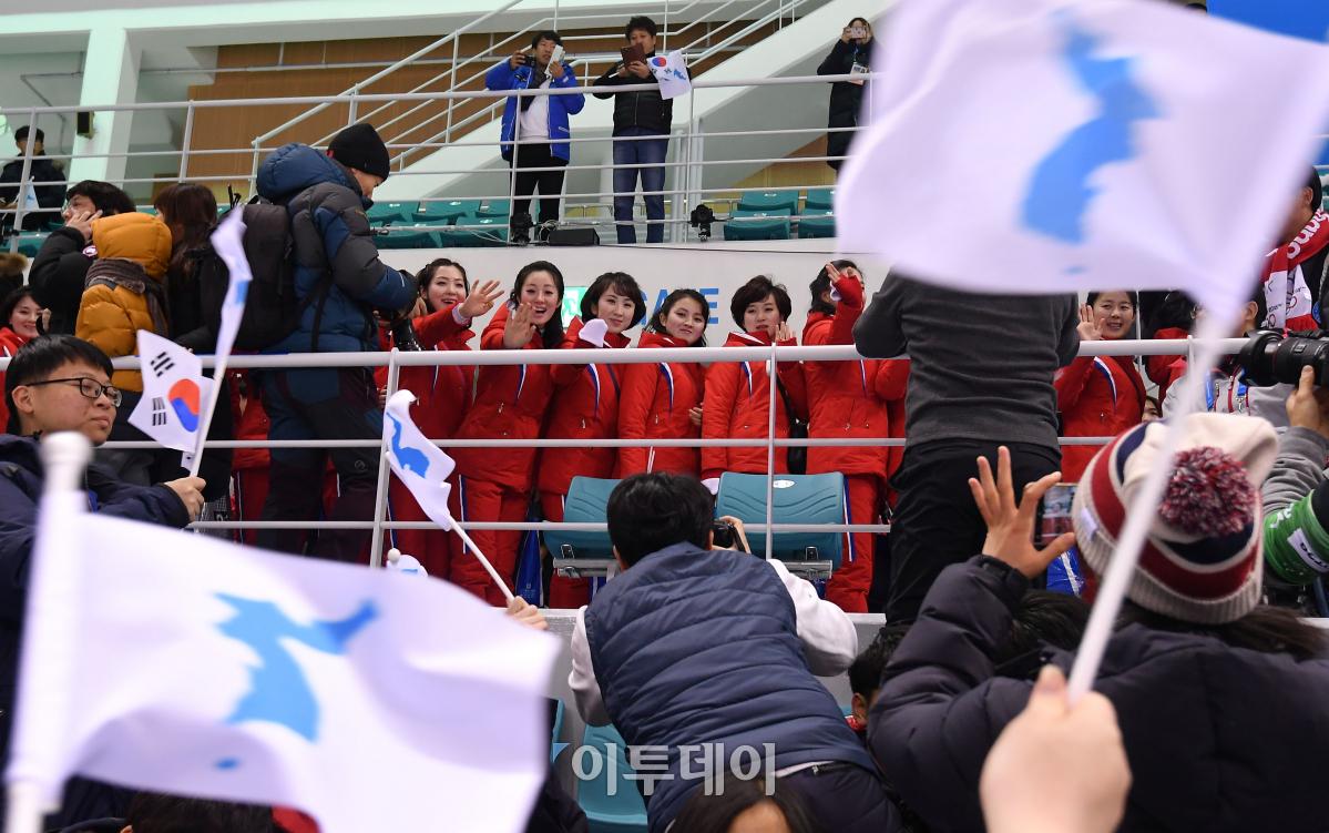 2018 평창동계올림픽 여자아이스하키 남북단일팀의 예선 첫경기인 스위스전이 10일 강원 강릉시 관동하키센터에서 열렸다. 북한 응원단이 관중들을 향해 손을 흔들고 있다. 이동근 기자 foto@