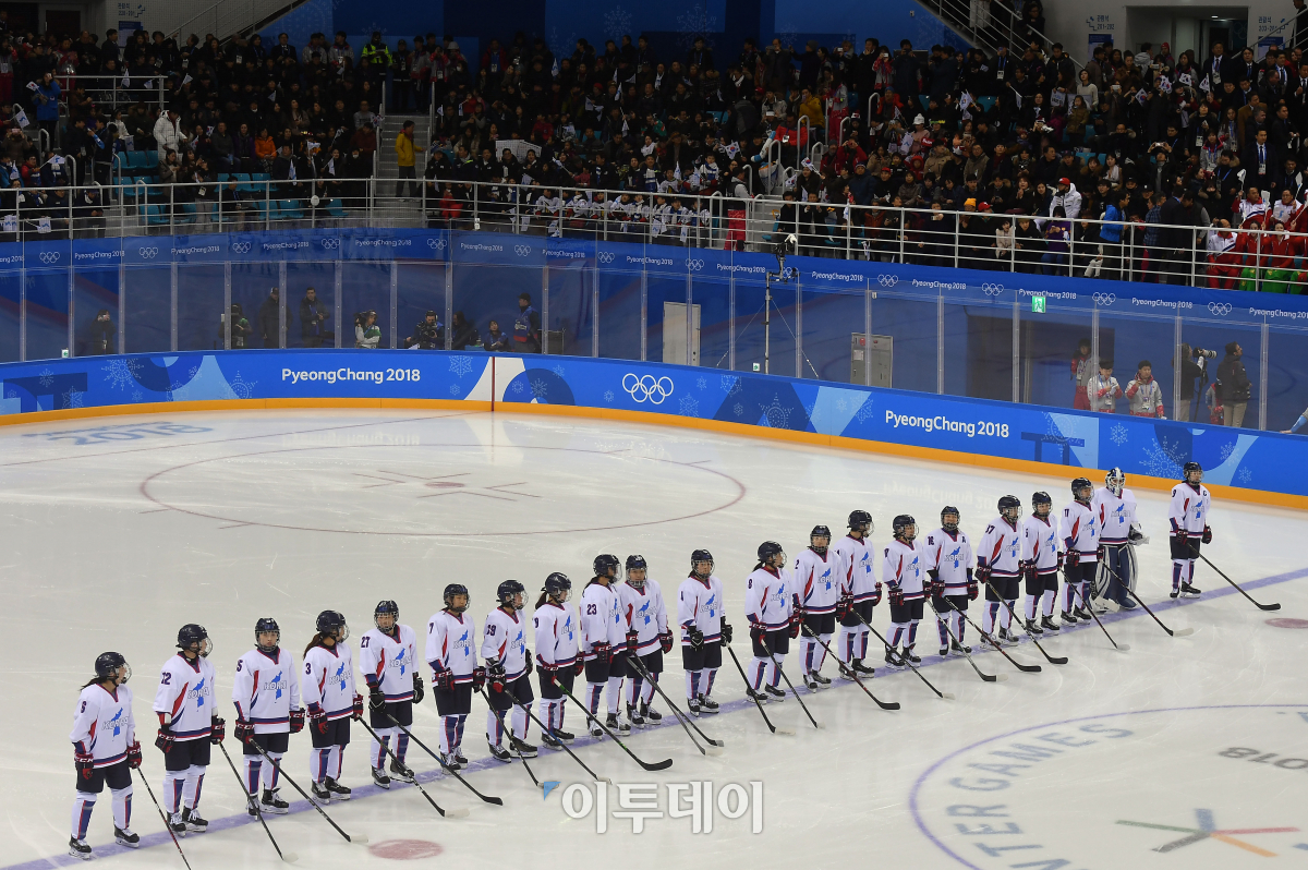 2018 평창동계올림픽 여자아이스하키 남북단일팀의 예선 첫경기인 스위스전이 10일 강원 강릉시 관동하키센터에서 열렸다. 단일팀 선수들이 경기 시작을 기다리고 있다. 이동근 기자 foto@