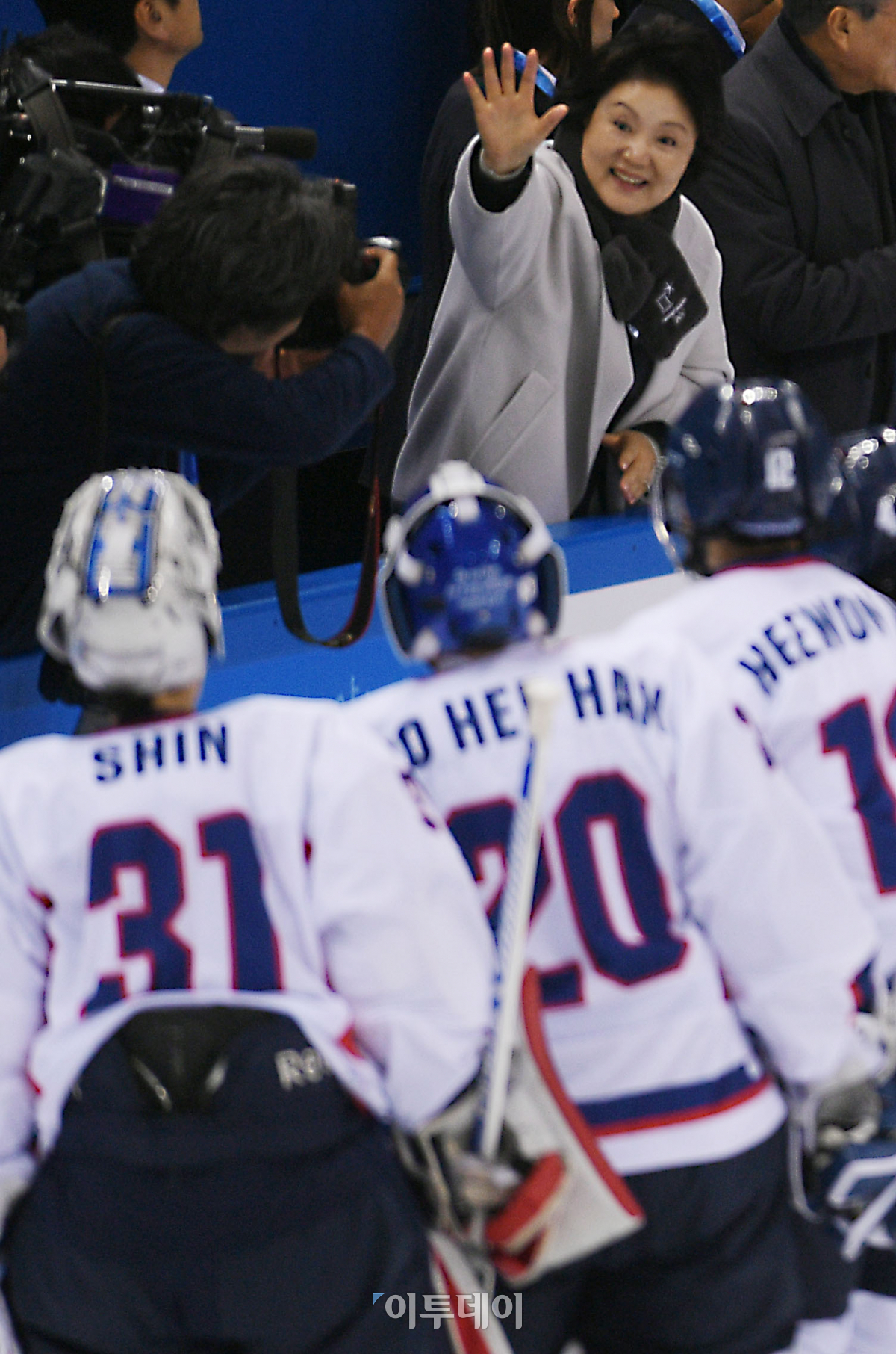 2018 평창동계올림픽 여자아이스하키 남북단일팀의 예선 첫경기인 스위스전이 10일 강원 강릉시 관동하키센터에서 열렸다. 김정숙 여사가 경기를 마친 선수들을 격려하고 있다. 이동근 기자 foto@