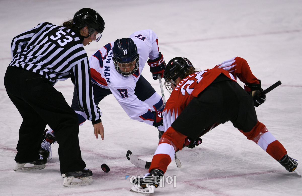 2018 평창동계올림픽 여자아이스하키 남북단일팀의 예선 첫경기인 스위스전이 10일 강원 강릉시 관동하키센터에서 열렸다. 단일팀 한수진(가운데) 선수가 상대편과 페이스오프를 하고 있다. 이동근 기자 foto@