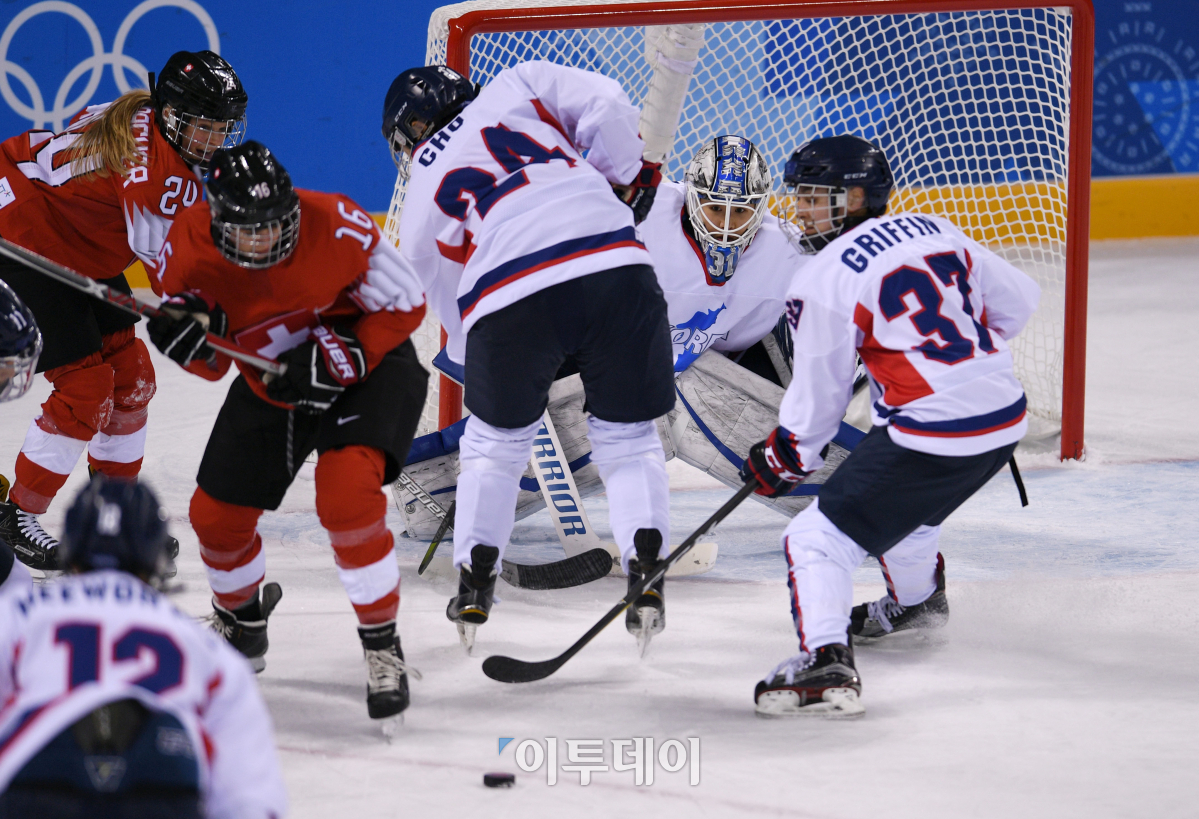 2018 평창동계올림픽 여자아이스하키 남북단일팀의 예선 첫경기인 스위스전이 10일 강원 강릉시 관동하키센터에서 열렸다. 단일팀 선수들이 상대 공격을 막아내고 있다. 이동근 기자 foto@