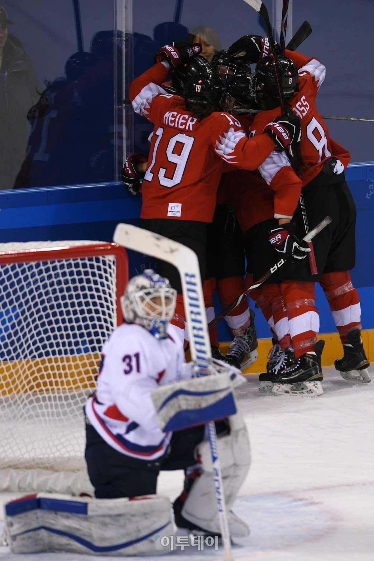 2018 평창동계올림픽 여자아이스하키 남북단일팀의 예선 첫경기인 스위스전이 10일 강원 강릉시 관동하키센터에서 열렸다. 스위스 선수들이 선제골을 넣은 후 기뻐하고 있다. 이동근 기자 foto@