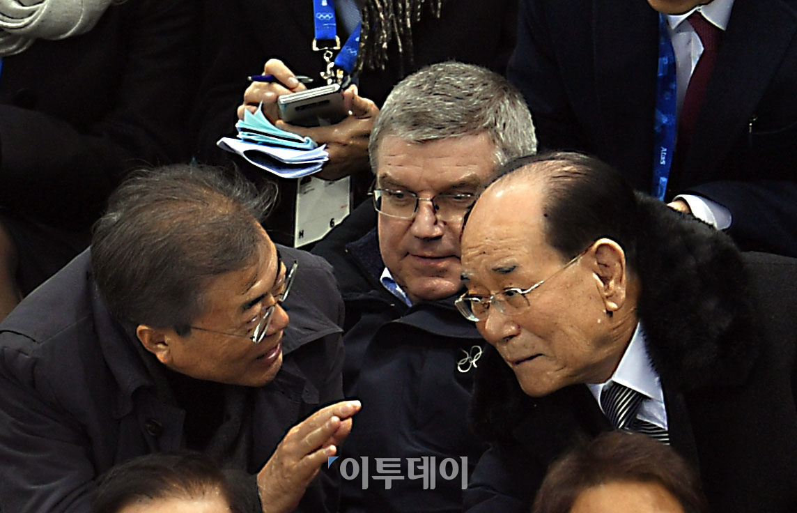 문재인(왼쪽) 대통령과 김영남 북한 최고인민회의 상임위원장이 10일 강원 강릉시 관동하키센터에서 열린 2018 평창동계올림픽 여자 아이스하키 남북단일팀 예선 첫 경기 스위스전에서 대화하고 있다. 가운데는 토마스 바흐 IOC 위원장. 이동근 기자 foto@