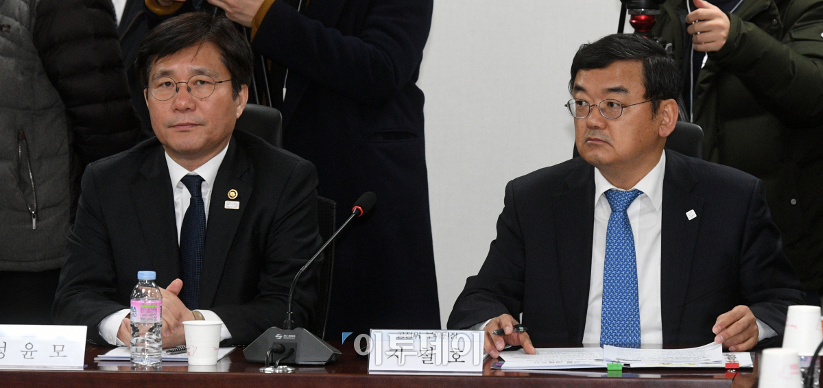 성윤모(왼쪽) 특허청장과 지철호 공정위 부위원장이 12일 오전 서울 여의도 국회 의원회관에서 열린 기술탈취 근절대책 당정협의에서 우원식 더불어민주당 원내대표의 모두발언을 듣고 있다. 이동근 기자 foto@