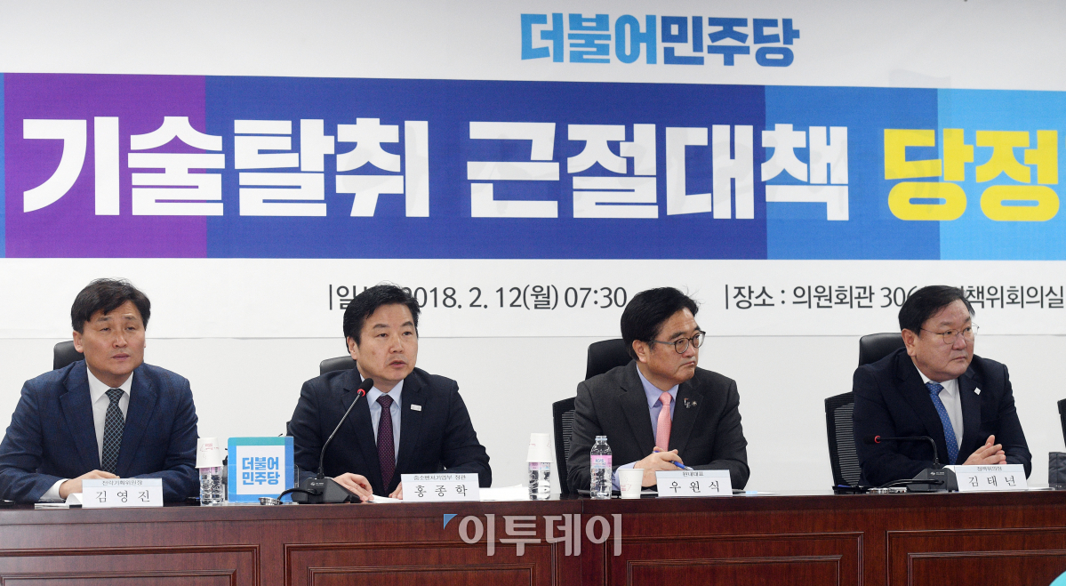 홍종학(왼쪽에서 두 번째) 중소벤처기업부 장관이 12일 오전 서울 여의도 국회 의원회관에서 열린 기술탈취 근절대책 당정협의에서 모두발언을 하고 있다. 이동근 기자 foto@