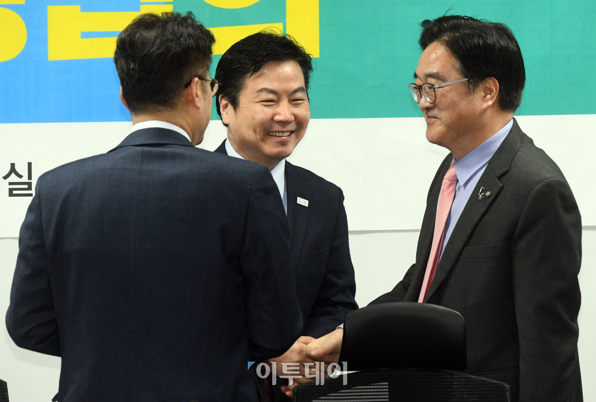 우원식(오른쪽) 더불어민주당 원내대표와 홍종학 중소벤처기업부 장관이 12일 오전 서울 여의도 국회 의원회관에서 열린 기술탈취 근절대책 당정협의에서 악수하고 있다. 이동근 기자 foto@