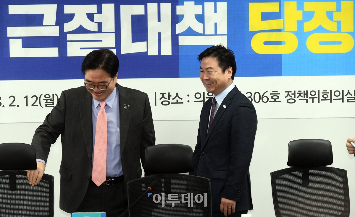 우원식(왼쪽) 더불어민주당 원내대표와 홍종학 중소벤처기업부 장관이 12일 오전 서울 여의도 국회 의원회관에서 열린 기술탈취 근절대책 당정협의에서 대화하고 있다. 이동근 기자 foto@