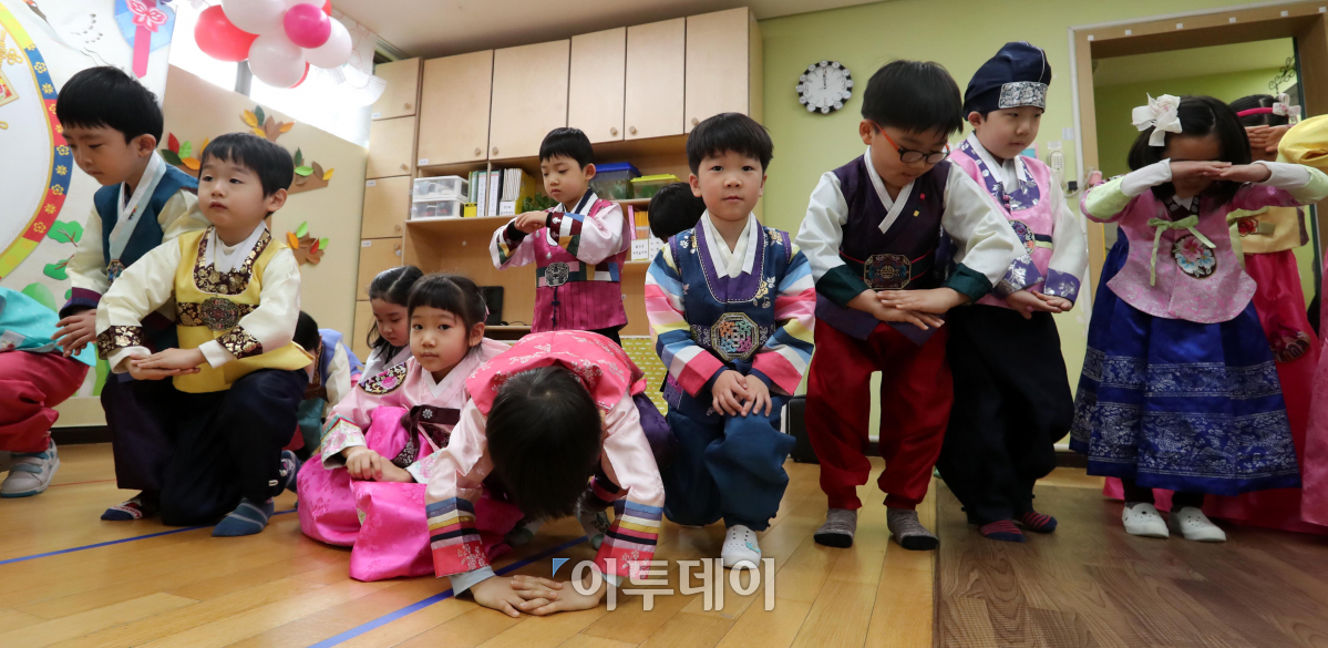 설을 나흘 앞둔 12일 서울 송파구 부리도어린이집에서 한복을 곱게 차려입은 어린이들이 마을 어르신들에게 세배를 하고 있다. 이동근 기자 foto@