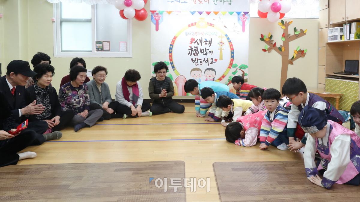설을 나흘 앞둔 12일 서울 송파구 부리도어린이집에서 한복을 곱게 차려입은 어린이들이 마을 어르신들에게 재롱잔치를 선보이고 있다. 이동근 기자 foto@