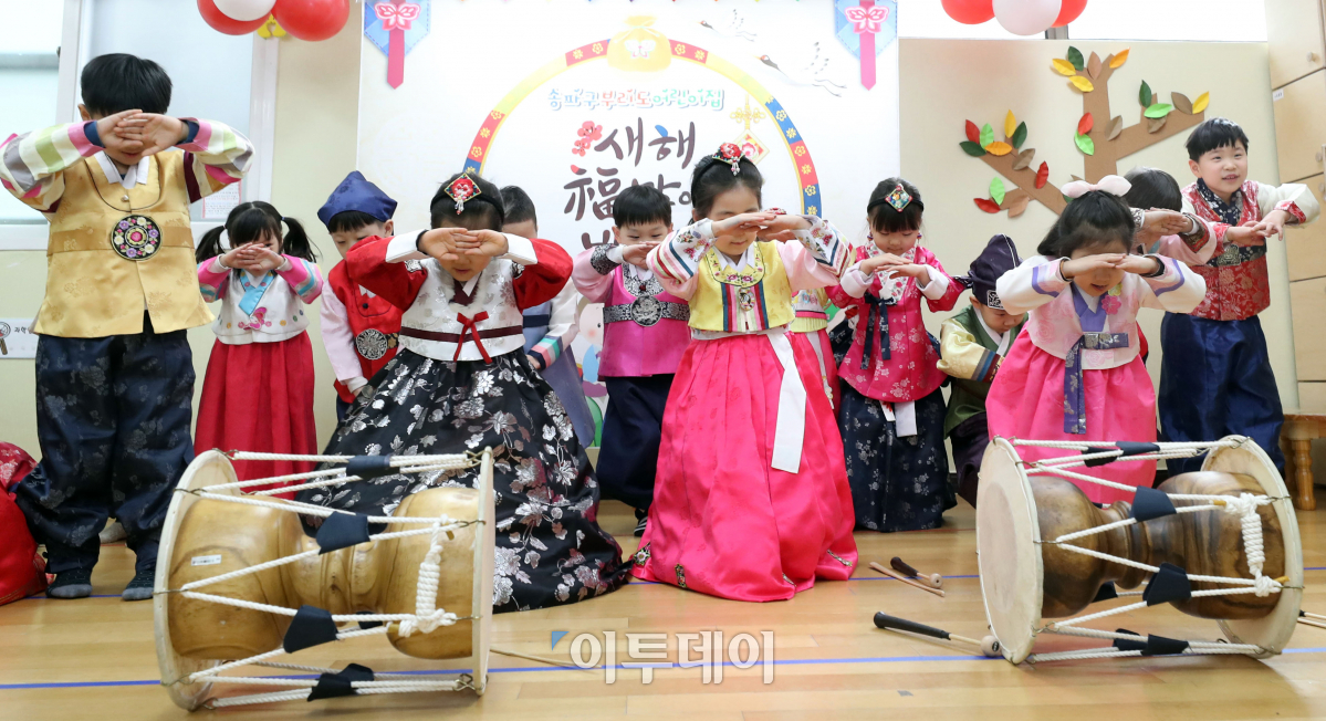 설을 나흘 앞둔 12일 서울 송파구 부리도어린이집에서 한복을 곱게 차려입은 어린이들이 마을 어르신들에게 재롱잔치를 선보이고 있다. 이동근 기자 foto@