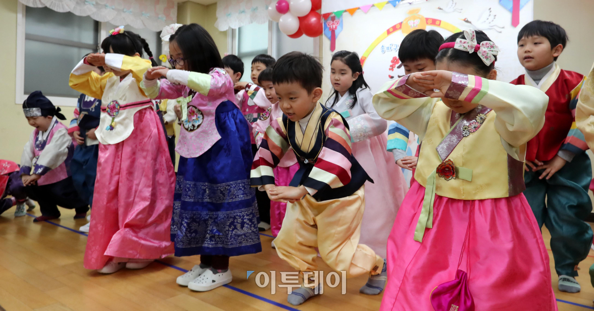 설을 나흘 앞둔 12일 서울 송파구 부리도어린이집에서 한복을 곱게 차려입은 어린이들이 마을 어르신들에게 세배를 하고 있다. 이동근 기자 foto@
