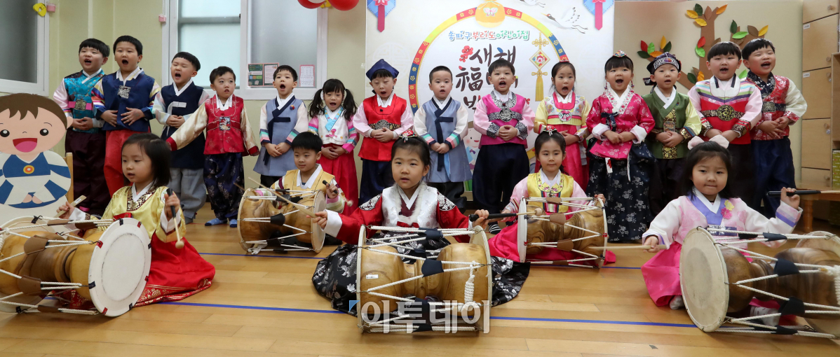 설을 나흘 앞둔 12일 서울 송파구 부리도어린이집에서 한복을 곱게 차려입은 어린이들이 마을 어르신들에게 재롱잔치를 선보이고 있다. 이동근 기자 foto@