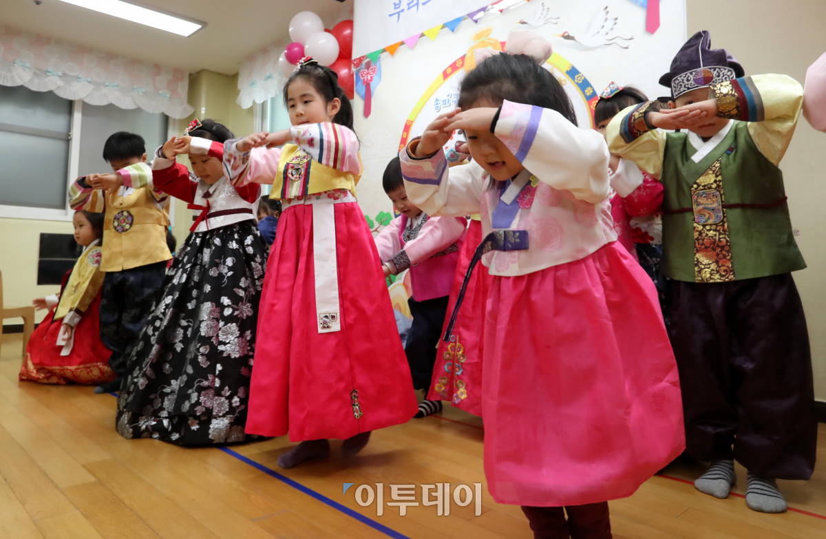 설을 나흘 앞둔 12일 서울 송파구 부리도어린이집에서 한복을 곱게 차려입은 어린이들이 마을 어르신들에게 세배를 하고 있다. 이동근 기자 foto@