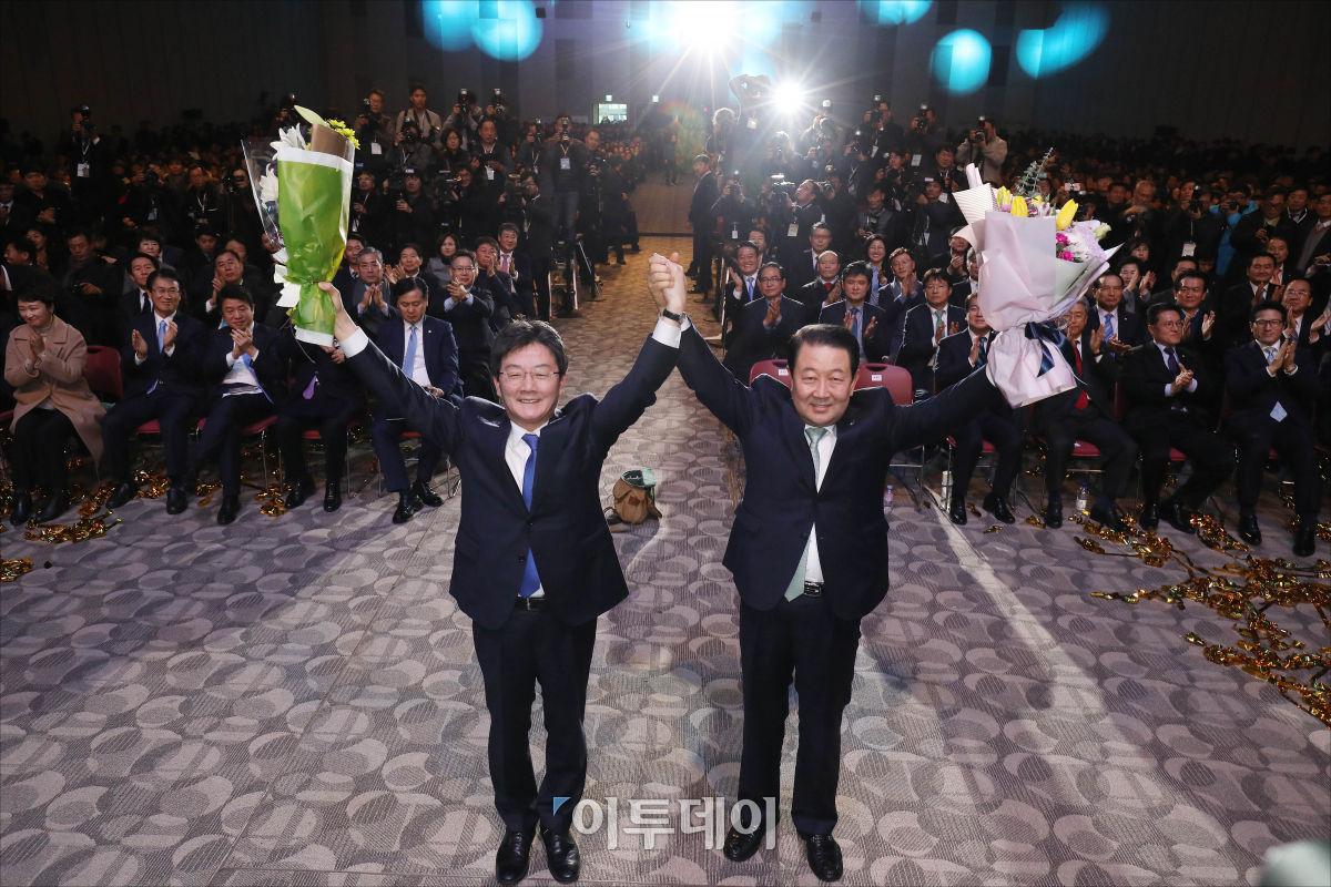 유승민(왼쪽), 박주선 바른미래당 공동대표가 13일 경기도 고양시 킨텍스 제2전시장에서 열린 바른미래당 출범대회에서 손을 들어 인사하고 있다. 이동근 기자 foto@