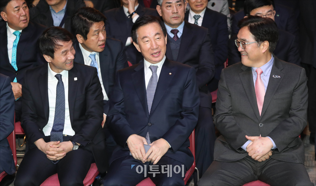 한병도 청와대 정무수석, 김성태 자유한국당 원내대표, 우원식 더불어민주당 원내대표(왼쪽부터)가 13일 경기도 고양시 킨텍스 제2전시장에서 열린 바른미래당 출범대회에서 대화하고 있다. 이동근 기자 foto@