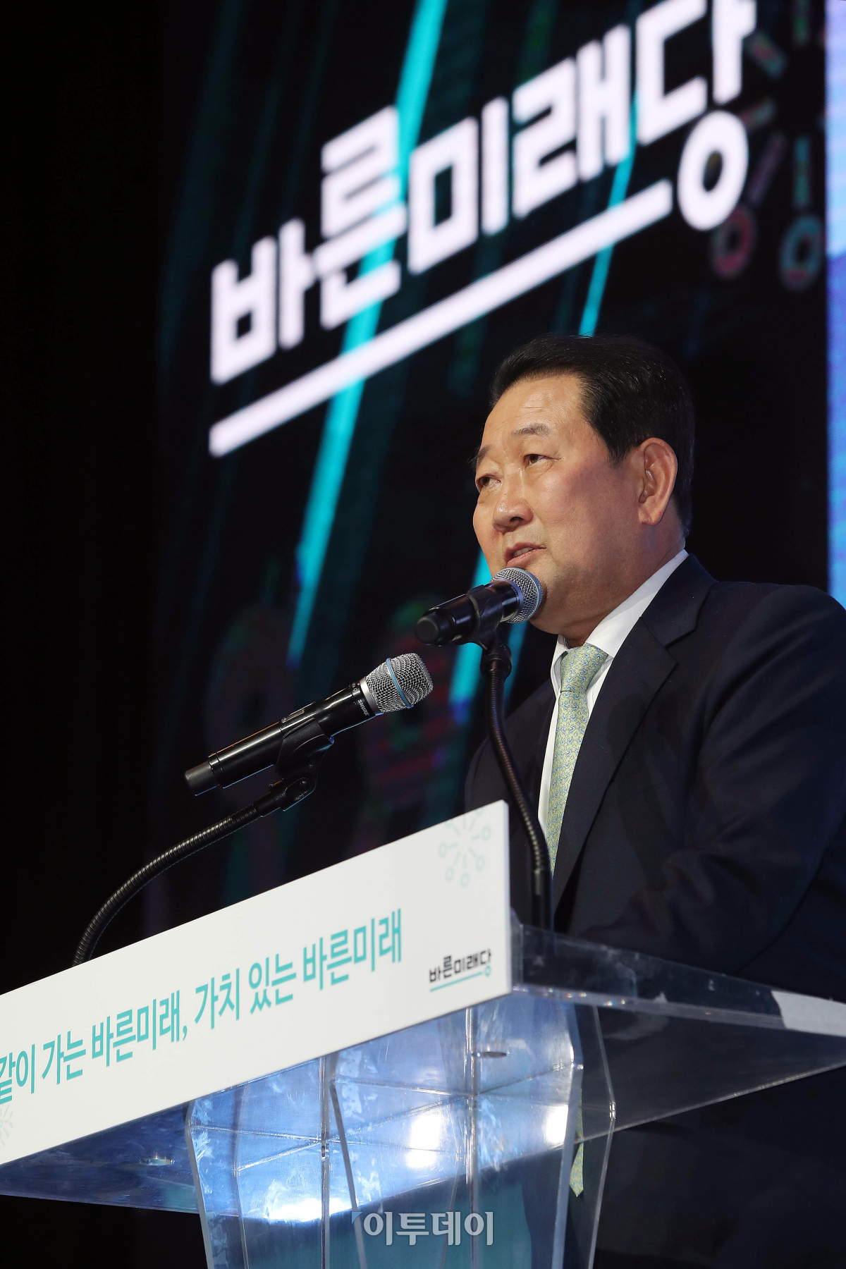 박주선 바른미래당 공동대표가 13일 경기도 고양시 킨텍스 제2전시장에서 열린 바른미래당 출범대회에서 인사말을 하고 있다. 이동근 기자 foto@