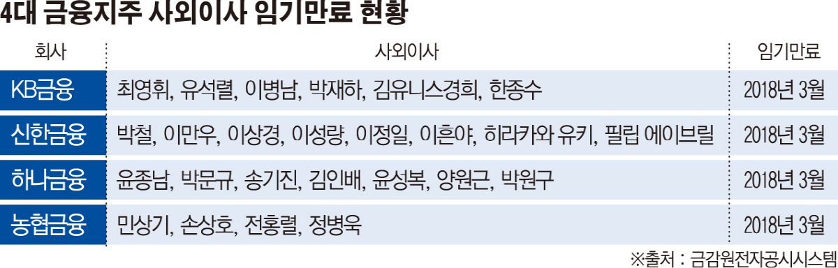 ◇당국 압박, 회장 사추위 제외… 사외이사 권력화 우려 = 당초 사추위에서 지주 회장을 제외시켜야 한다는 건 금융당국의 요구 사항이었다. 회장이 사외이사를 추천하는 데 영향을 미치고, 이렇게 선임된 사외이사들이 회장의 연임을 결정하는 ‘셀프 연임’이 공정하지 않다는 지적에 따른 것이다. 이에 금융당국은 사외이사가 회장을 감시·견제하면서 차기 회장이 될 만한 역량 있는 인물을 발굴해야 한다는 제도의 취지를 제대로 살릴 수 있는 기회가 마련됐다는 반응이다. 앞서 최종구 금융위원장은 “CEO 스스로 가까운 분들로 이사회를 구성해 본인의 연임을 유리하게 짠다”며 셀프 연임 논란에 불을 지폈다.