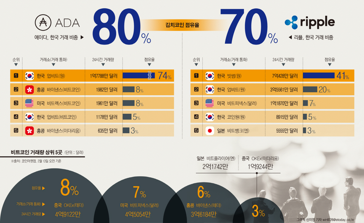 리플과 에이다와 같이 국내 편중도가 높은 코인을 ‘김치코인’이라고 부를 정도다.