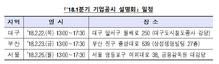 금감원은 서울과 영남권 소재 사업보고서 제출대상 법인을 대상으로 대구(22일), 부산(23일), 서울(26일)에서 차례로 기업공시 설명회를 개최한다.