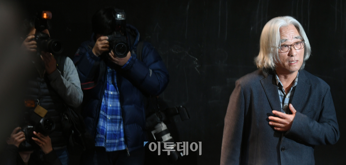 성추행에 이어 성폭행논란에 휩싸인 이윤택 전 예술단거리패 예술감독이 19일 오전 서울 종로구 30스튜디오에서 공개사과 기자회견을 열고 입장을 밝히고 있다. 이 전 감독은 이날 "피해자에게 진심으로 사죄한다"며 법적책임을 포함한 그 어떤 벌도 받겠다는 입장을 밝혔다. 이동근 기자 foto@