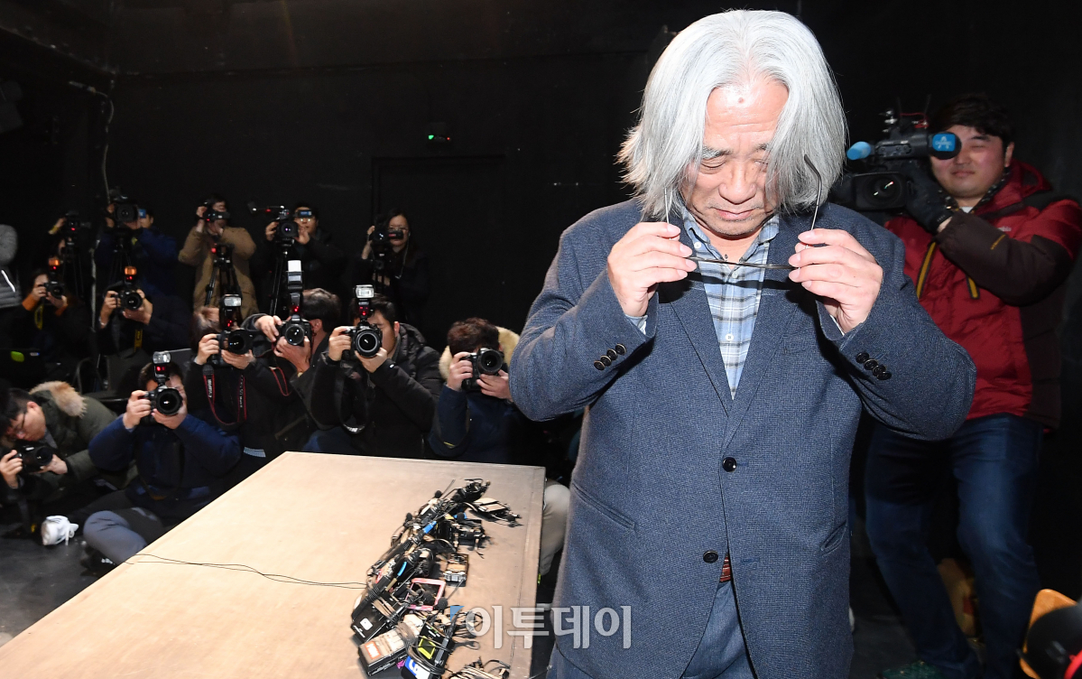 성추행에 이어 성폭행논란에 휩싸인 이윤택 전 예술단거리패 예술감독이 19일 오전 서울 종로구 30스튜디오에서 공개사과 기자회견을 마치고 자리를 이동하고 있다. 이 전 감독은 이날 "피해자에게 진심으로 사죄한다"며 법적책임을 포함한 그 어떤 벌도 받겠다는 입장을 밝혔다. 이동근 기자 foto@