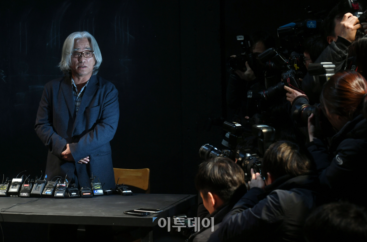 성추행에 이어 성폭행논란에 휩싸인 이윤택 전 예술단거리패 예술감독이 19일 오전 서울 종로구 30스튜디오에서 공개사과 기자회견을 열고 입장을 밝히고 있다. 이 전 감독은 이날 "피해자에게 진심으로 사죄한다"며 "법적책임을 포함한 그 어떤 벌도 받겠다"는 입장을 밝혔다. 이동근 기자 foto@