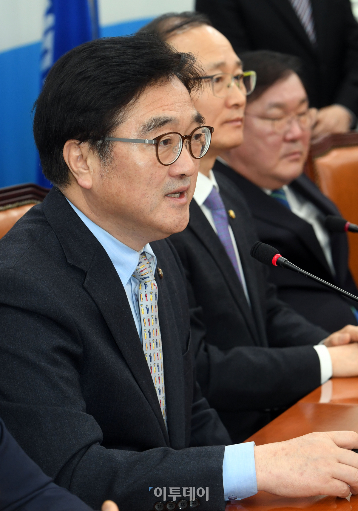 우원식 더불어민주당 원내대표가 19일 서울 여의도 국회에서 열린 한국GM 대책TF 협력업체 긴급간담회에서 모두발언을 하고 있다. 이동근 기자 foto@