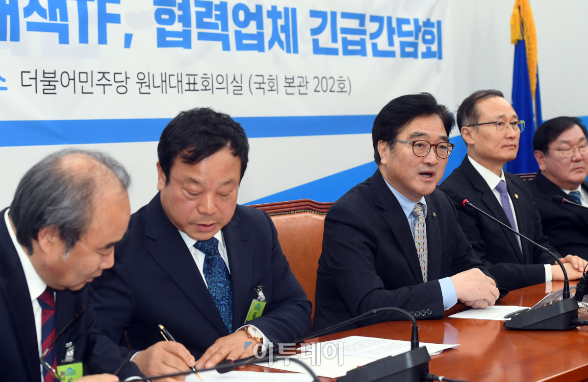 우원식(가운데) 더불어민주당 원내대표가 19일 서울 여의도 국회에서 열린 한국GM 대책TF 협력업체 긴급간담회에서 모두발언을 하고 있다. 이동근 기자 foto@