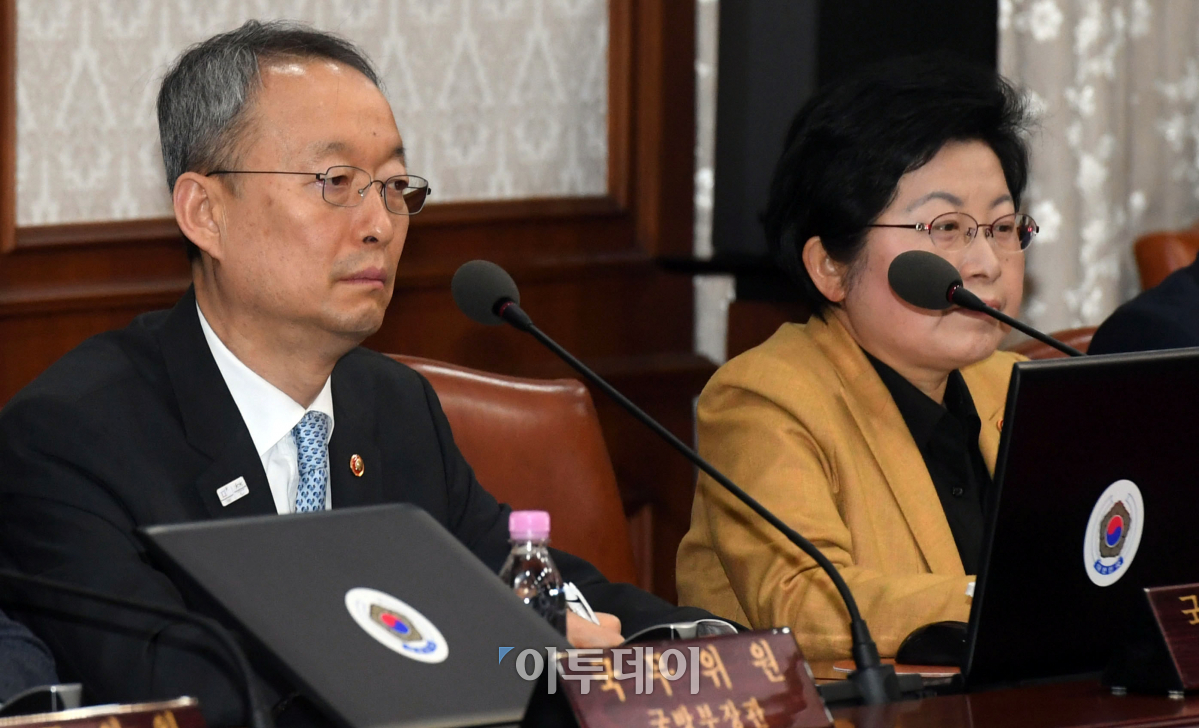 백운규(왼쪽) 산업통상자원부 장관과 정현백 여성가족부 장관이 20일 오전 서울 세종로 정부서울청사에서 열린 국무회의에서 이낙연 국무총리의 모두발언을 듣고 있다. 이동근 기자 foto@