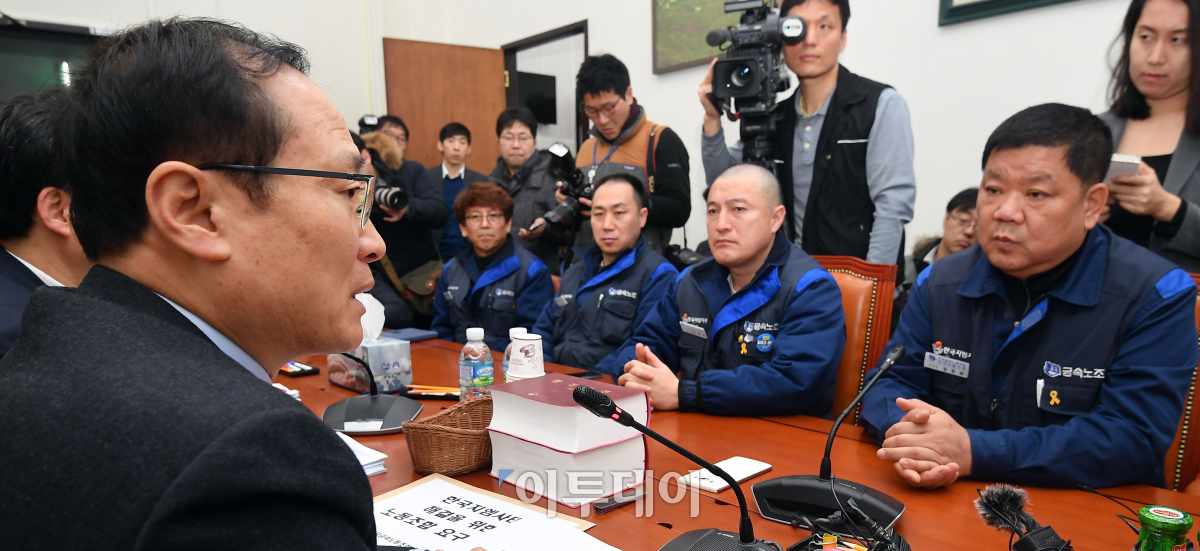 홍영표(왼쪽) 더불어민주당 한국GM 대책TF위원장이 20일 오전 서울 여의도 국회에서 열린 한국GM 임한택(오른쪽) 노조위원장 등 노조지도부와 면담을 갖고 있다. 이동근 기자 foto@