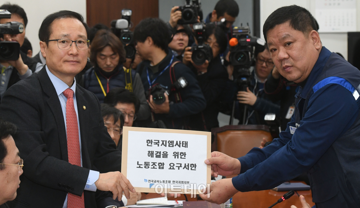 임한택(오른쪽) 한국GM 노조위원장이 20일 오전 서울 여의도 국회를 방문해 홍영표 더불어민주당 한국GM 대책 TF위원장에게 노동조합 요구서한을 전달하고 있다. 이동근 기자 foto@