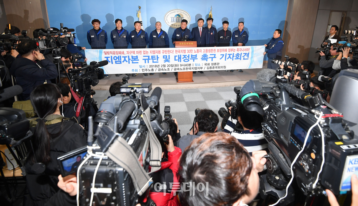 임한택 한국GM 노조위원장이 20일 서울 여의도 국회 정론관에서 일방적 공장폐쇄를 규탄하는 기자회견을 하고 있다. 이동근 기자 foto@