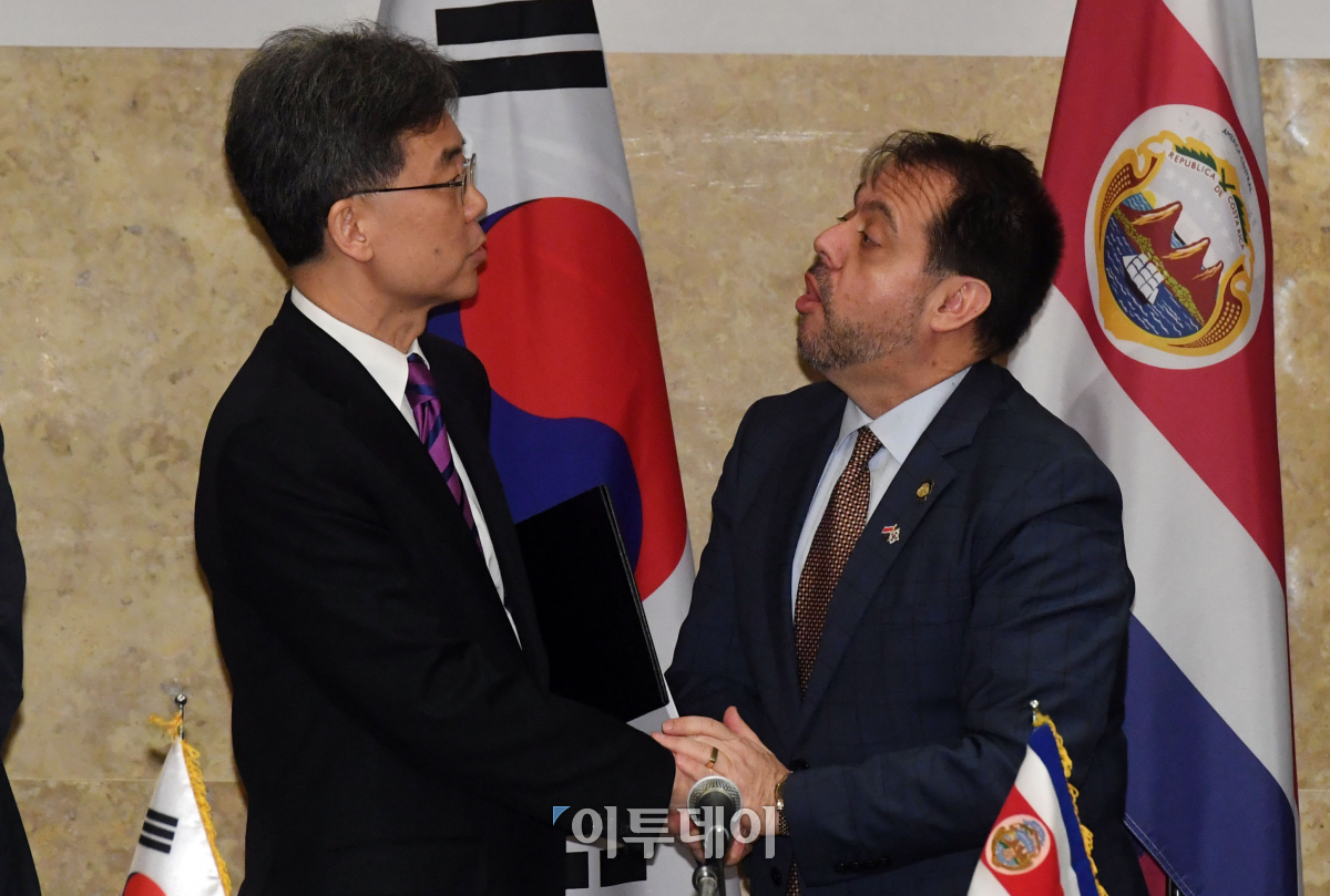 김현종(왼쪽) 산업통상자원부 통상교섭본부장과 알렉산더 모라 코스타리카 대외무역부 장관이 21일 오전 서울 소공동 롯데호텔에서 열린 한-중미 FTA정식서명식에서 FTA 선언문에 서명 후 악수하고 있다. 이동근 기자 foto@
