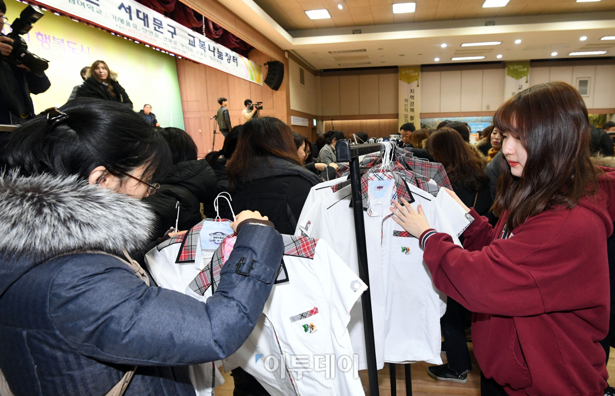 2018 서대문구 교복 나눔장터가 21일 서울 서대문구청 대강당에서 열린 가운데 학생과 학부모들이 교복을 고르고 있다. 이날 서대문구는 가재울중, 신연중 등 구내 6개 중학교 졸업생들과 재학생들로부터 기증받은 1,200점의 교복을 품목별로 겨울 재킷 5,000원, 카디건 4,000원, 그 밖의 조끼, 셔츠 등은 3,000원에 판매했다. 이동근 기자 foto@