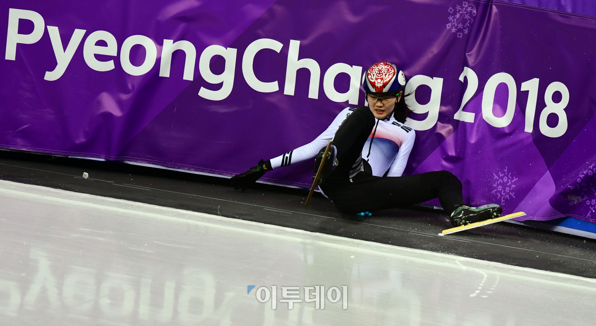 22일 강원도 강릉아이스아레나에서 열린 2018 평창동계올림픽 여자 쇼트트랙 1000m 결승에서 심석희가 넘어지며 안전펜스에 부딫히고 있다. 이동근 기자 foto@