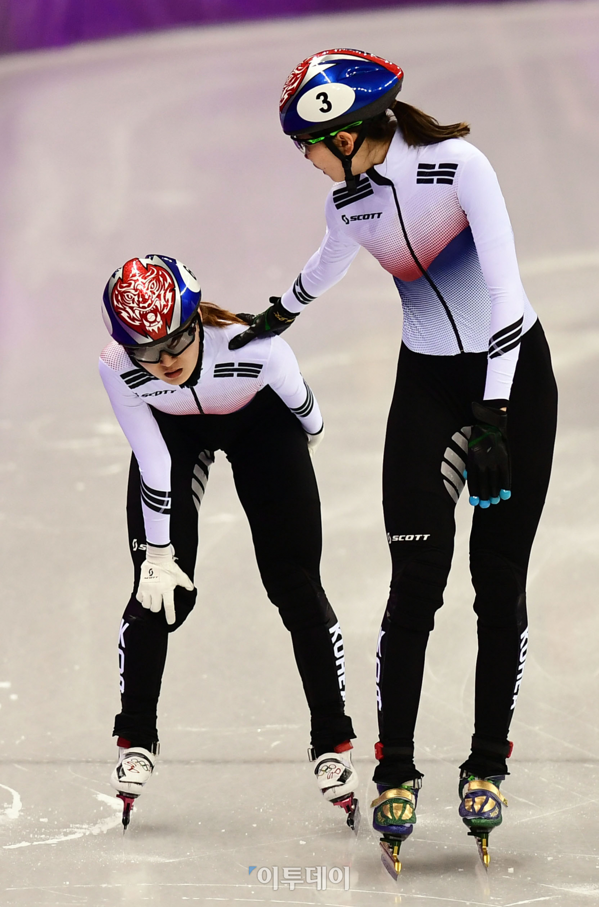 22일 강원도 강릉아이스아레나에서 열린 2018 평창동계올림픽 여자 쇼트트랙 1000m 결승에서 심석희(오른쪽)가 함께 넘어진 최민정의 상태를 확인하고 있다. 이동근 기자 foto@