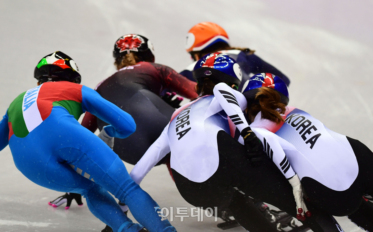 22일 강원도 강릉아이스아레나에서 열린 2018 평창동계올림픽 여자 쇼트트랙 1000m 결승에서 심석희와 최민정이 레이스 도중 부딪혀 넘어지고 있다. 이동근 기자 foto@
