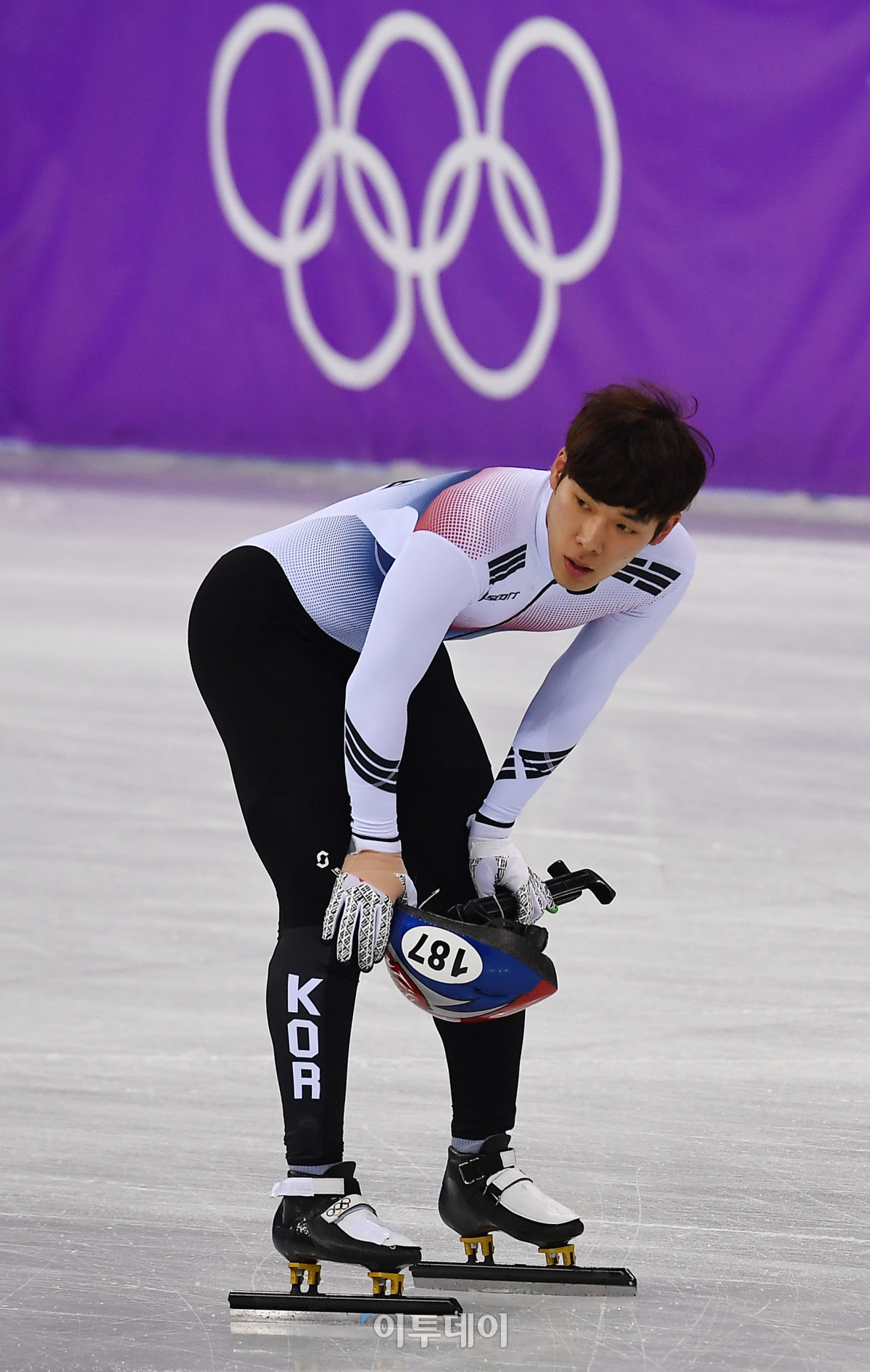 22일 강릉 아이스아레나에서 열린 2018 평창동계올림픽 쇼트트랙 남자 5,000m 계주 결승에서 4위로 경기를 마친 김도겸이 아쉬운 표정을 짓고 있다. 이동근 기자 foto@