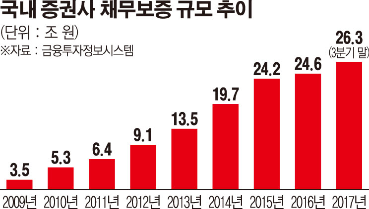 23일 금융통계 정보시스템에 따르면 국내 증권사들의 채무보증 총액은 지난해 3분기 말 기준 26조3446억 원으로 전년 말보다 1조7039억 원 증가했다. 국내 증권사 전체의 자기자본 48조9358억 원 대비 53.83%에 달하는 규모다. 글로벌 금융위기 직후인 2009년 3조 원대에 불과했던 채무보증 액수는 연평균 27% 성장세를 보이며 지난 8년간 7.5배 증가했다.