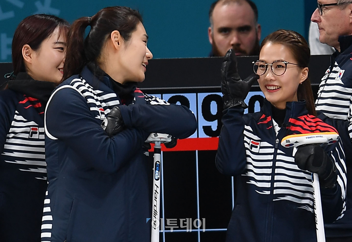 23일 강원도 강릉컬링센터에서 열린 2018 평창동계올림픽 여자 컬링 준결승 일본전 시작에 앞서 김은정(오른쪽에서 두 번째)이 코치와 대화하고 있다. 이동근 기자 foto@
