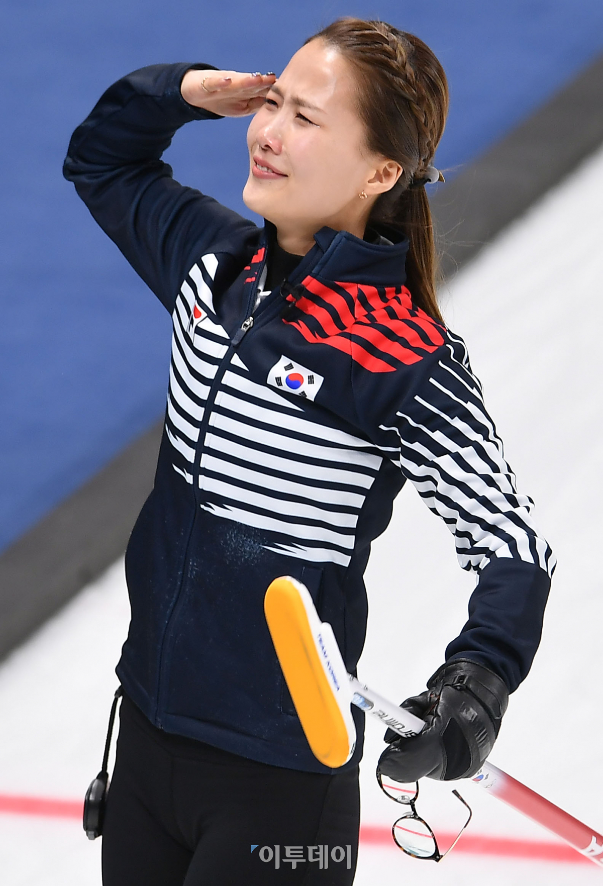 23일 강원도 강릉컬링센터에서 열린 2018 평창동계올림픽 여자 컬링 준결승 일본전에서 김은정이 연장 승부끝에 8대 7로 승리 후 관중을 향해 경례하고 있다. 이동근 기자 foto@
