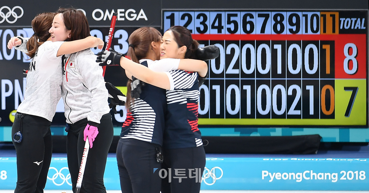23일 강원도 강릉컬링센터에서 열린 2018 평창동계올림픽 여자 컬링 준결승 일본전에서 연장 승부끝에 8대 7로 승리한 김경애와 김선영이 부둥켜 안고 있다. 오른쪽으로 일본의 후지사와와 모토하시 역시 서로를 안아주고 있다. 이동근 기자 foto@