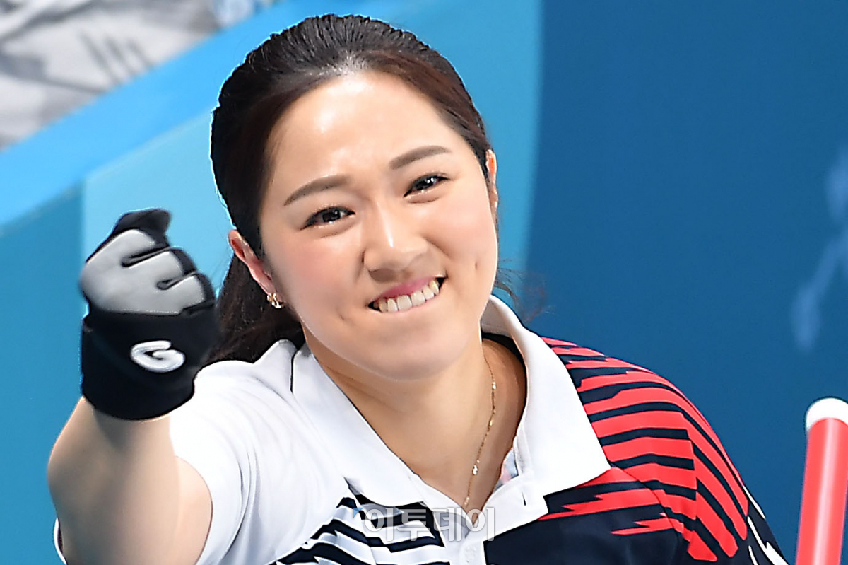 23일 강원도 강릉컬링센터에서 열린 2018 평창동계올림픽 여자 컬링 준결승 일본전에서 김경애가 연장 승부끝에 8대 7로 승리 후 주먹을 불끈 쥐고 있다. 이동근 기자 foto@