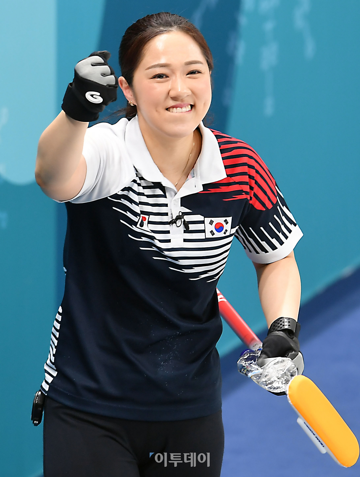 23일 강원도 강릉컬링센터에서 열린 2018 평창동계올림픽 여자 컬링 준결승 일본전에서 김경애가 연장 승부끝에 8대 7로 승리 후 주먹을 불끈 쥐고 있다. 이동근 기자 foto@