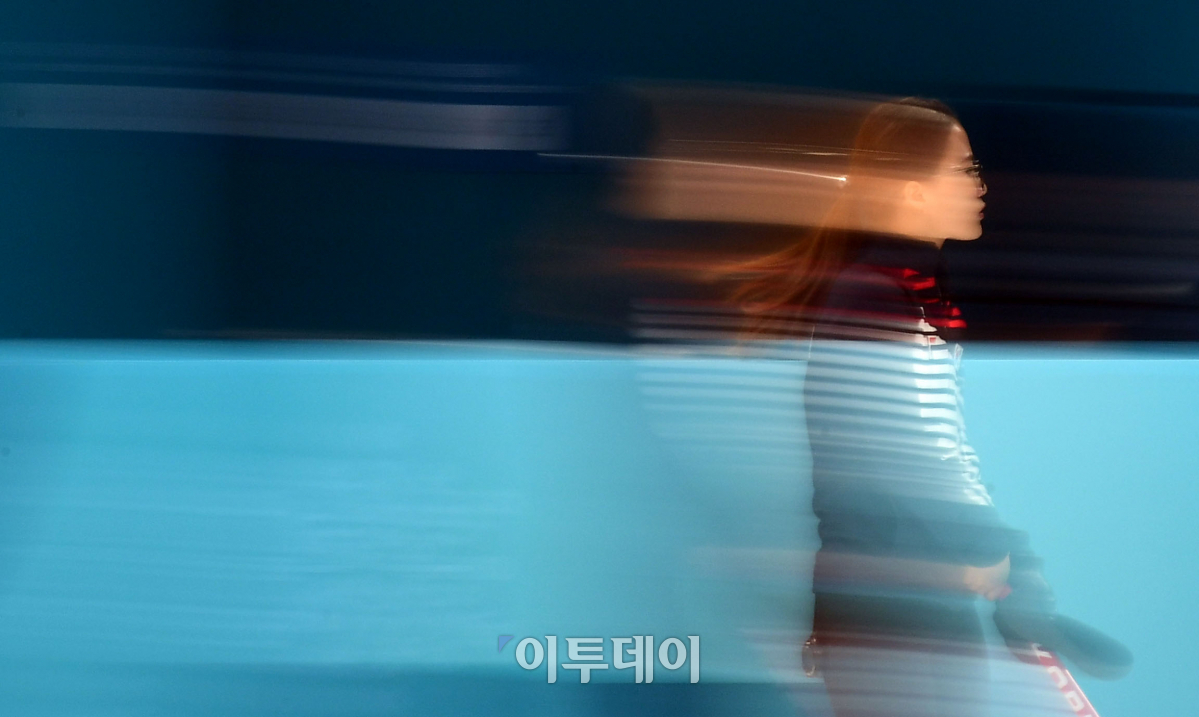 23일 강원도 강릉컬링센터에서 열린 2018 평창동계올림픽 여자 컬링 준결승 일본전에서 김은정이 투구를 위해 하우스를 향해 미끄러지듯 얼음을 타고 있다. 이동근 기자 foto@