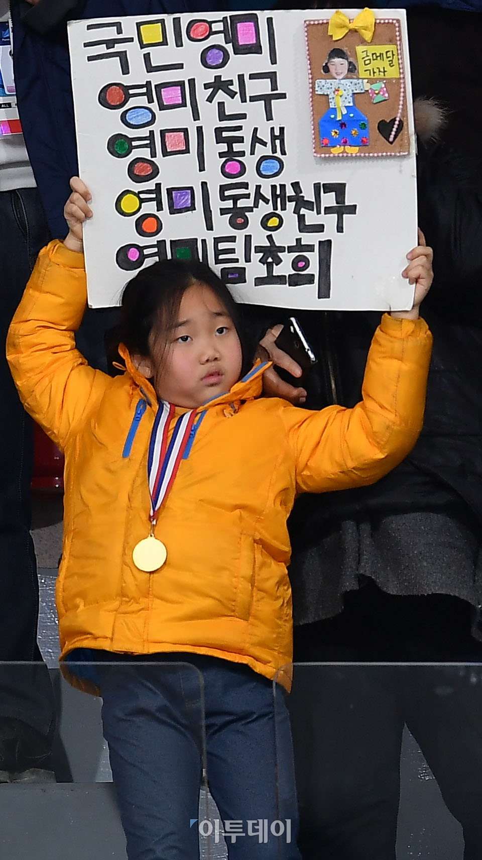23일 강원도 강릉컬링센터에서 열린 2018 평창동계올림픽 여자 컬링 준결승 일본전에서 한 어린이가 대표팀을 응원하는 손팻말을 들고 있다. 이동근 기자 foto@