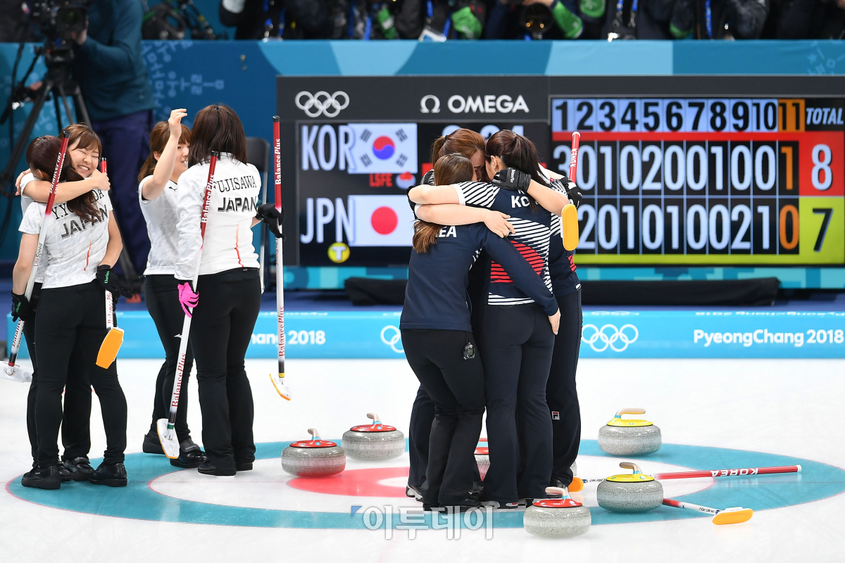 23일 강원도 강릉컬링센터에서 열린 2018 평창동계올림픽 여자 컬링 대한민국과 일본의 준결승에서 양팀이 경기가 끝나자 서로 부둥켜 안고 있다. 이동근 기자 foto@