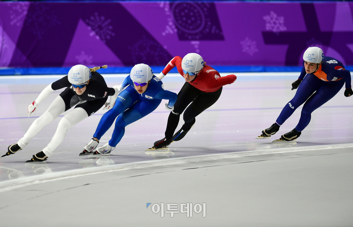 24일 강원도 강릉스피드스케이팅 경기장에서 열린 2018 평창동계올림픽 스피드스케이팅 여자 매스스타트 준결승에서 김보름(왼쪽에서 두 번째)이 역주하고 있다. 이동근 기자 foto@