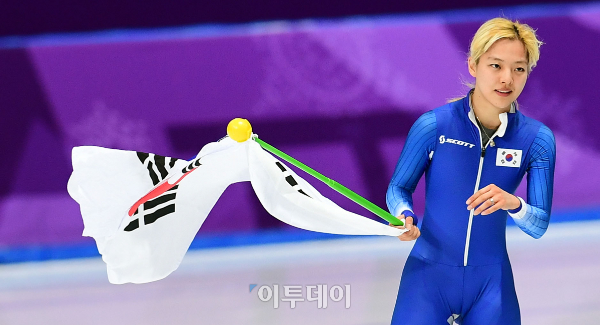 24일 강원도 강릉스피드스케이팅 경기장에서 열린 2018 평창동계올림픽 스피드스케이팅 여자 매스스타트 결승에서 김보름이 은메달 획득 후 태극기를 들고 트랙을 돌고 있다. 이동근 기자 foto@